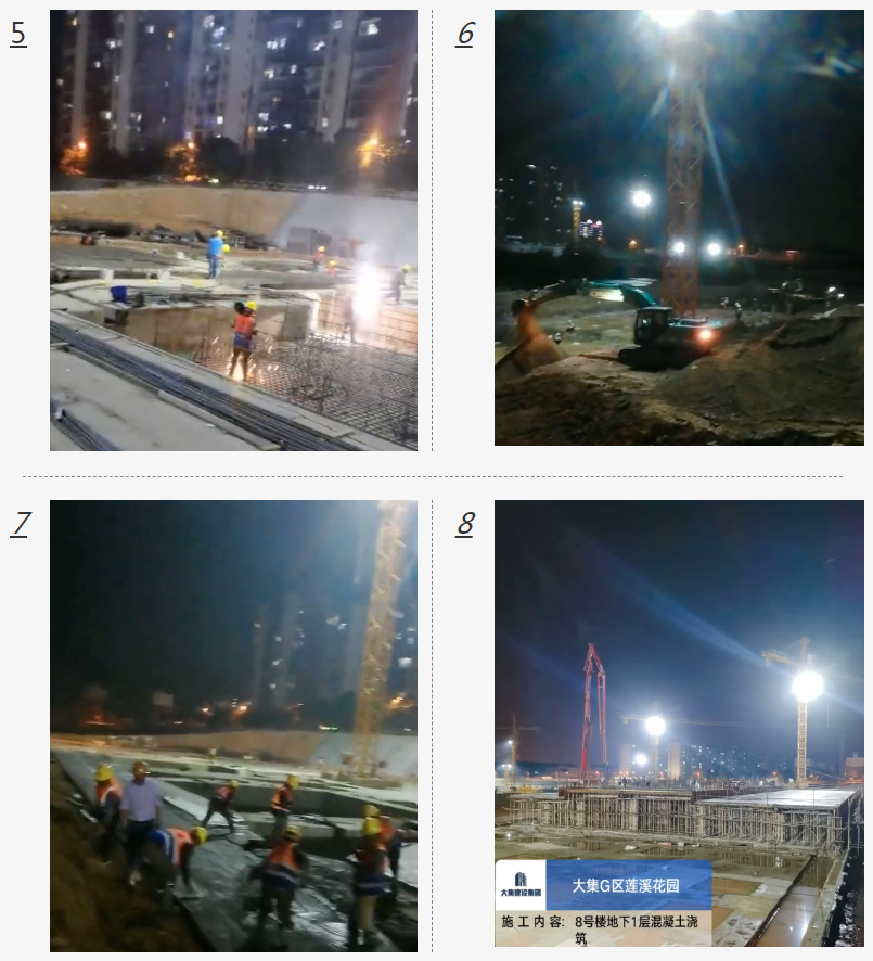 近期,由于雨水較多,項目工程進(jìn)度受到一定影響,在這沒有硝煙的戰(zhàn)場上,項目部一線員工小雨當(dāng)冒汗、大雨搶著干、連續(xù)陰雨賽著干,繼續(xù)發(fā)揚“5+2、白+黑、雨+晴”連續(xù)作戰(zhàn)精神,奮力拼搏,在保證安全和質(zhì)量的前提下,搶時間、趕進(jìn)度。截至目前,大集G區(qū)蓮溪花園項目已完成6#、8#樓一層柱、二層梁板施工,1#樓及副樓地下室頂板模板鋼筋已完成80%,2#樓、3#樓基礎(chǔ)鋼筋已完成40%,4#樓地下室頂板模板施工已完成50%,5#樓基礎(chǔ)鋼筋施工已完成50%,7#樓基礎(chǔ)鋼筋施工已完成70%。