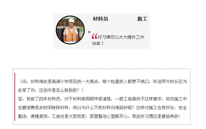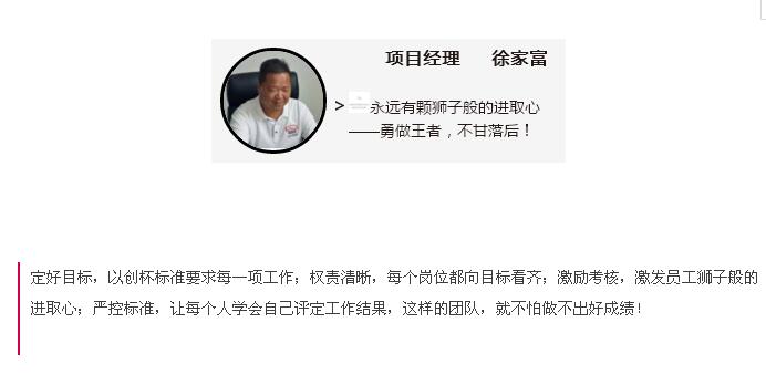 在7月份集團(tuán)各施工項(xiàng)目的績(jī)效考核評(píng)結(jié)果中,南湖小學(xué)項(xiàng)目以90分的高分榮獲第一名的好成績(jī)!項(xiàng)目績(jī)效考評(píng)嚴(yán)格復(fù)雜,涉及質(zhì)量、安全、資料、管理等方方面面,能取得這樣的成績(jī)實(shí)屬不易,問(wèn)起項(xiàng)目經(jīng)理徐家富項(xiàng)目取得高分的秘籍,他笑著說(shuō),讓每個(gè)人都有一顆獅子般的進(jìn)取心,勇做王者,不甘落后,一切都能迎刃而解!近期,我們深入項(xiàng)目學(xué)習(xí)才發(fā)現(xiàn),成功絕對(duì)不是偶然,不僅項(xiàng)目經(jīng)理?yè)碛幸活w獅子般的雄心,項(xiàng)目中的每一個(gè)人都有一顆拼搏進(jìn)取,不甘落后的心,使得他們對(duì)每一個(gè)細(xì)節(jié)的管理都嚴(yán)格按照標(biāo)準(zhǔn),精益求精,方才成就今日的累累碩果!