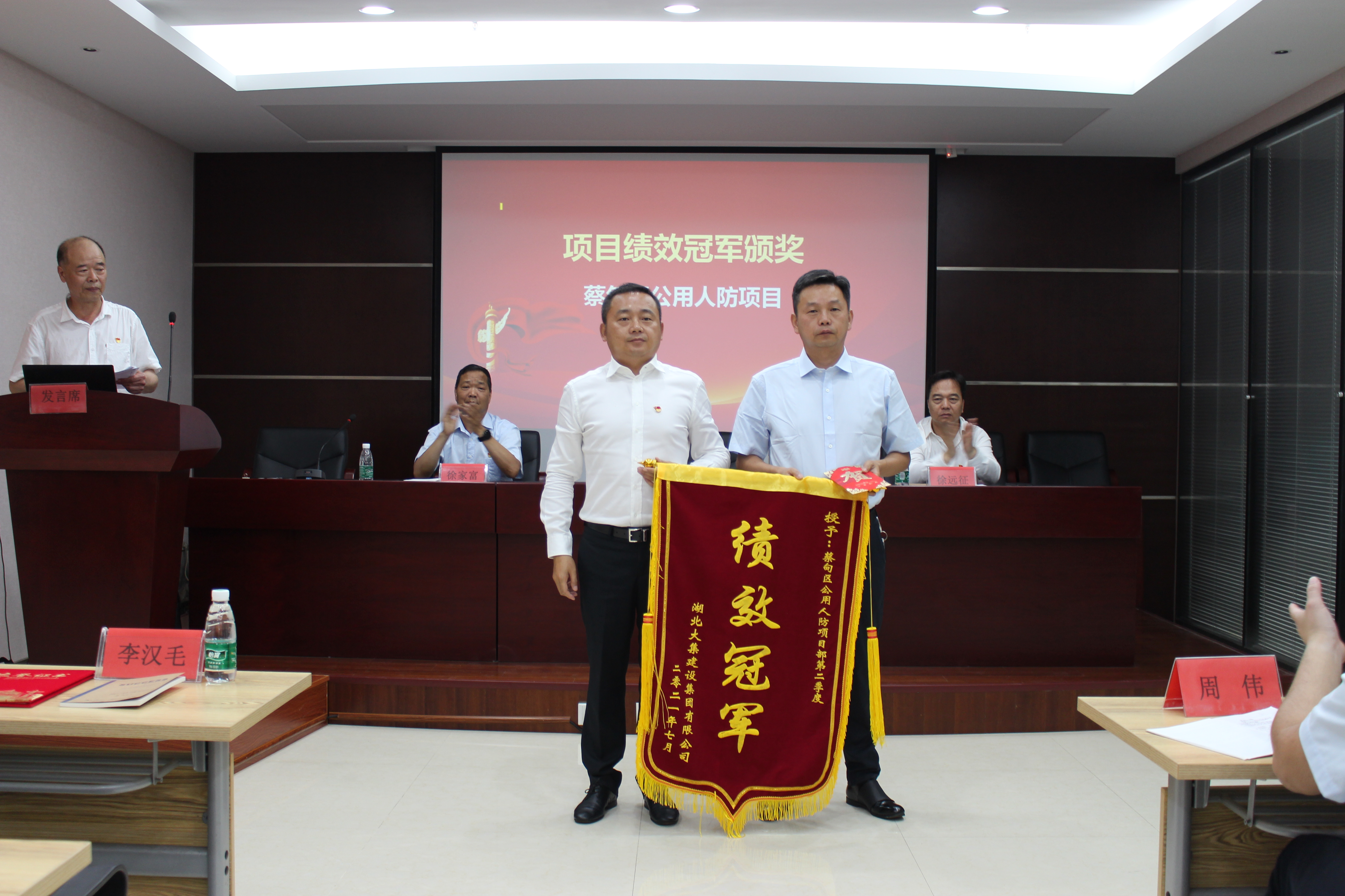 集團董事長徐濤為此次績效考評中的冠軍項目——蔡甸區(qū)公用人防項目部頒發(fā)錦旗和獎金。